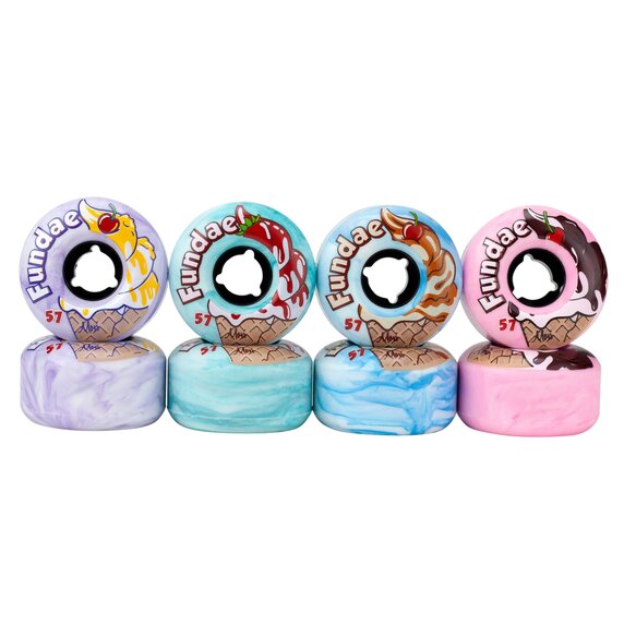 The Fundae wheels are 57mm in diameter and 34mm wide and are available in the following creme colors: Lavender (purple), Bubble Gum (pink), Birthday Cake (blue) and Creme de Menthe (turquoise).